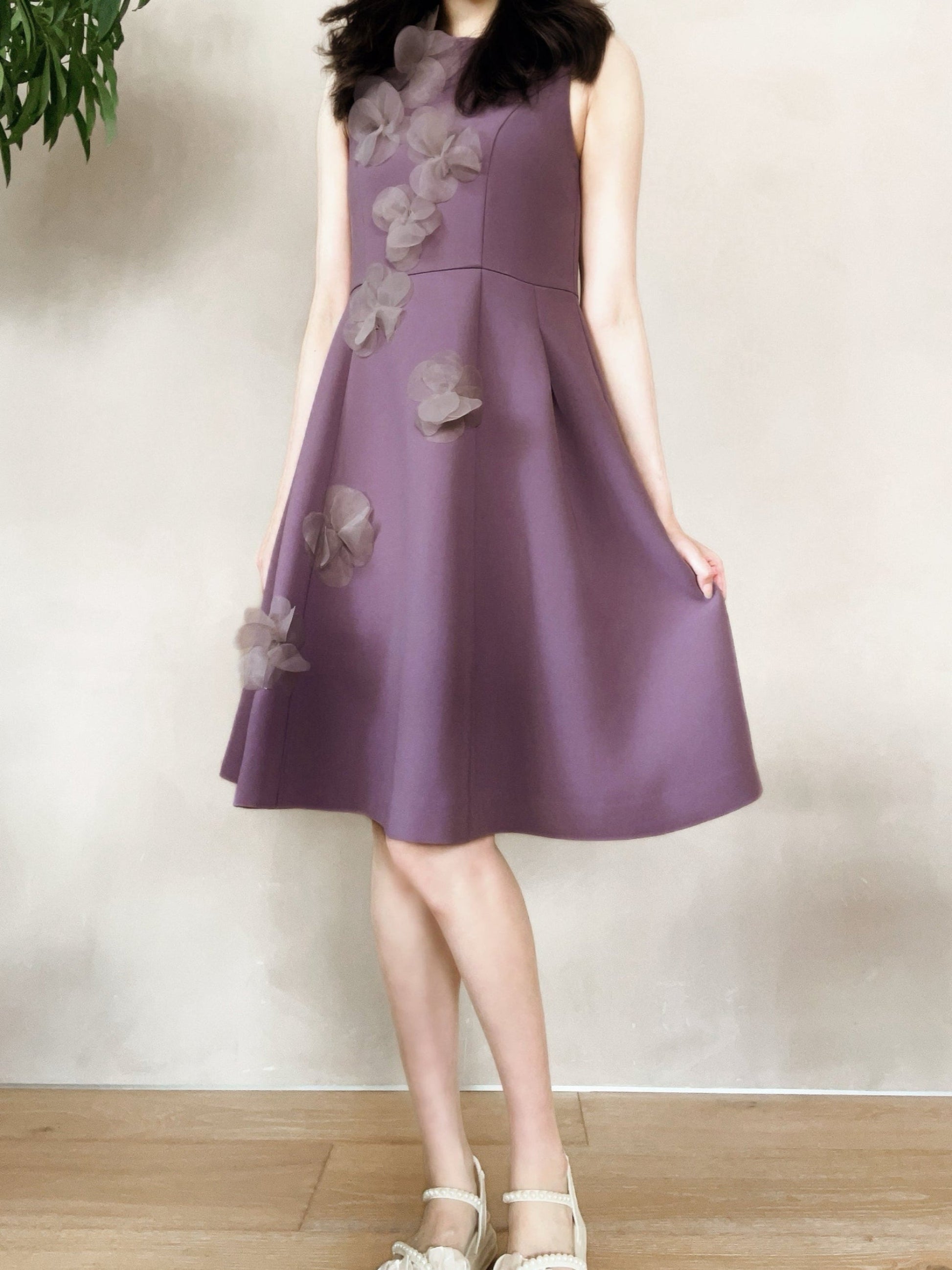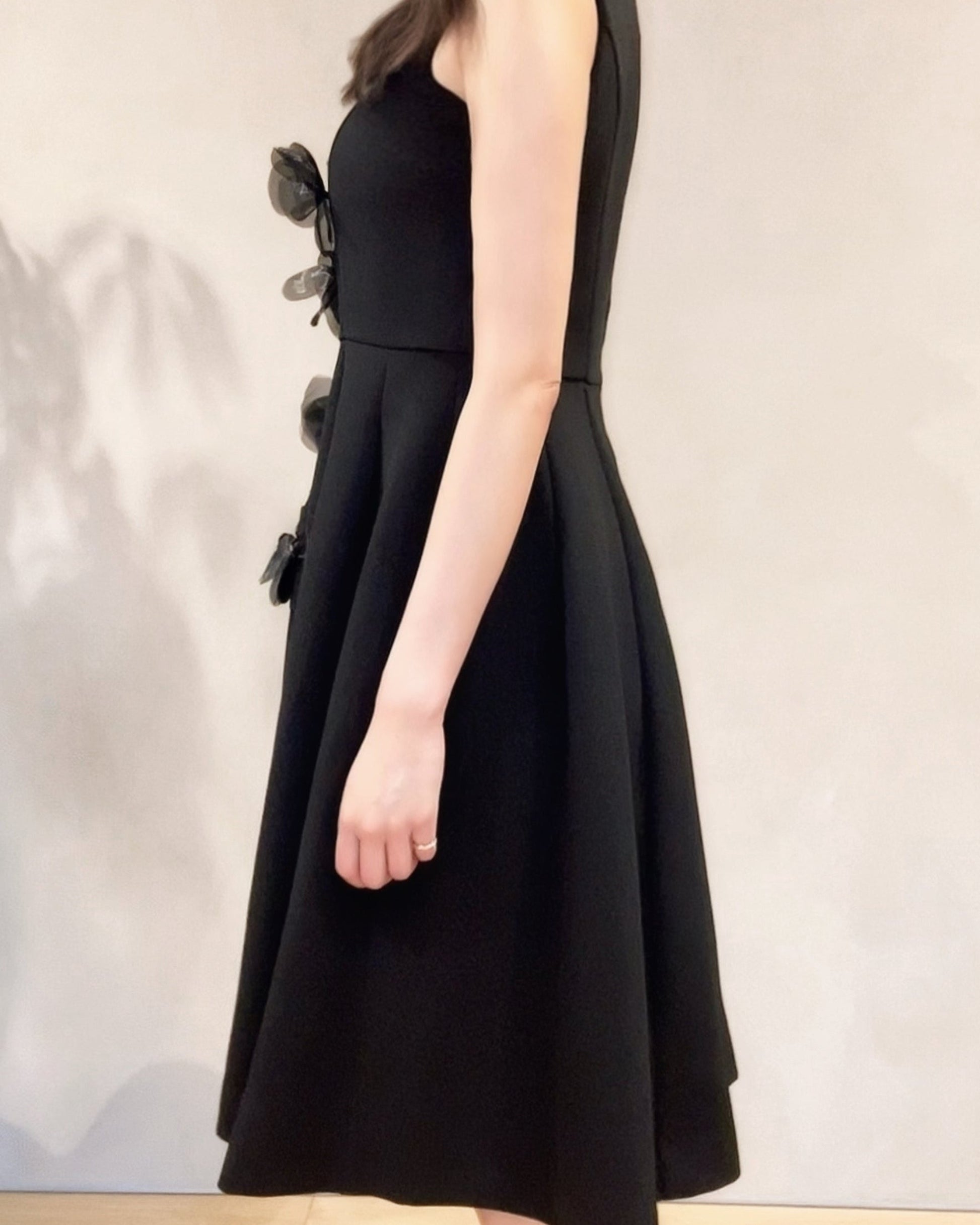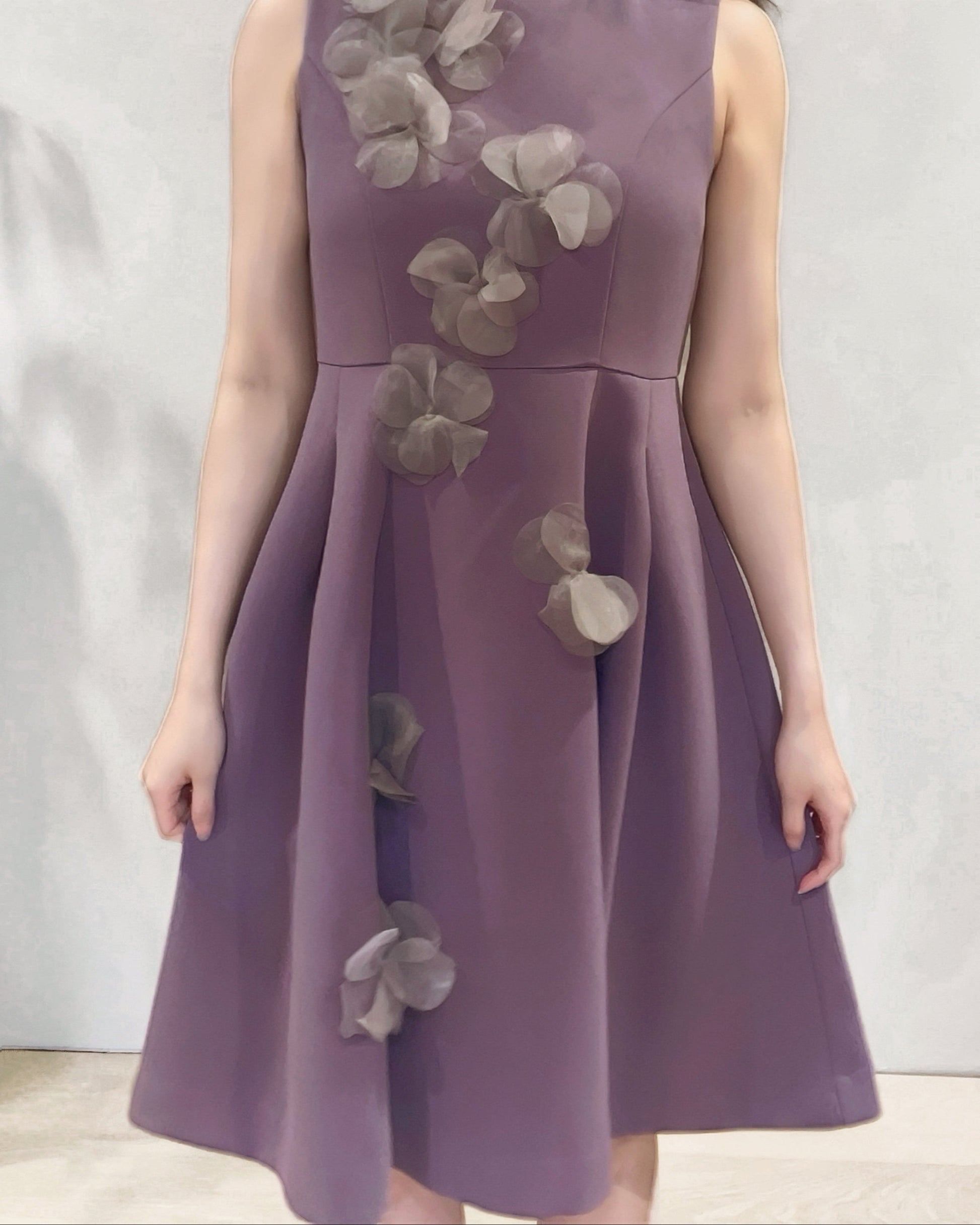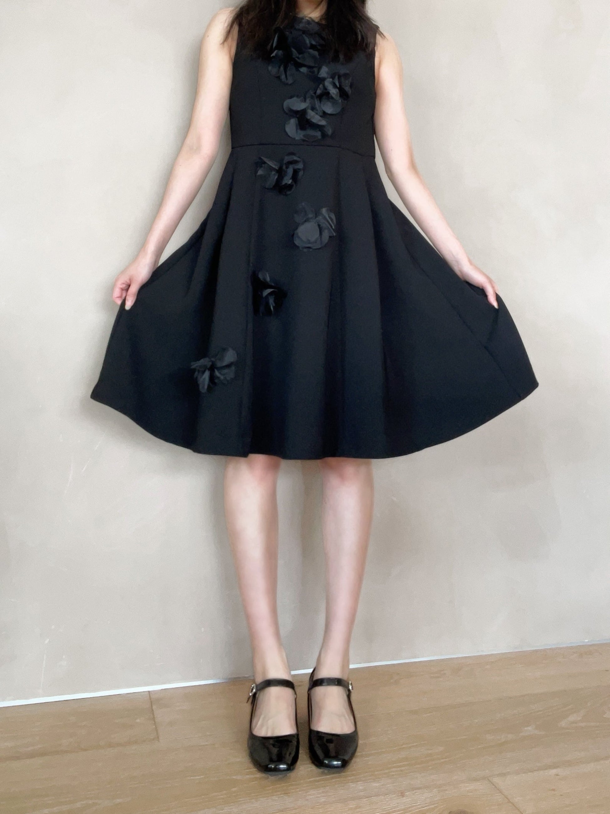 立体的なフラワーデザインが目を引く、華やかさと上品さを兼ね備えたワンピース。