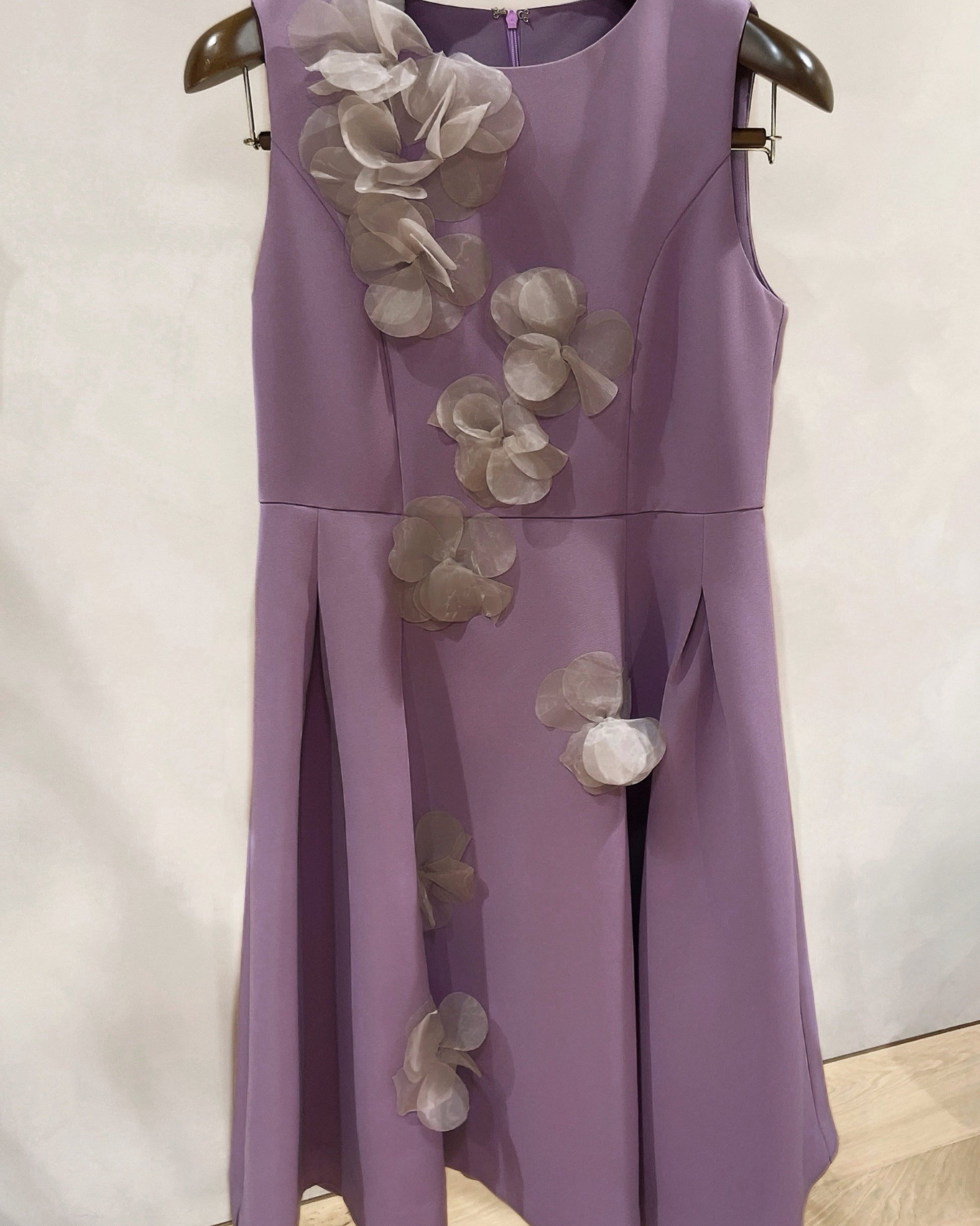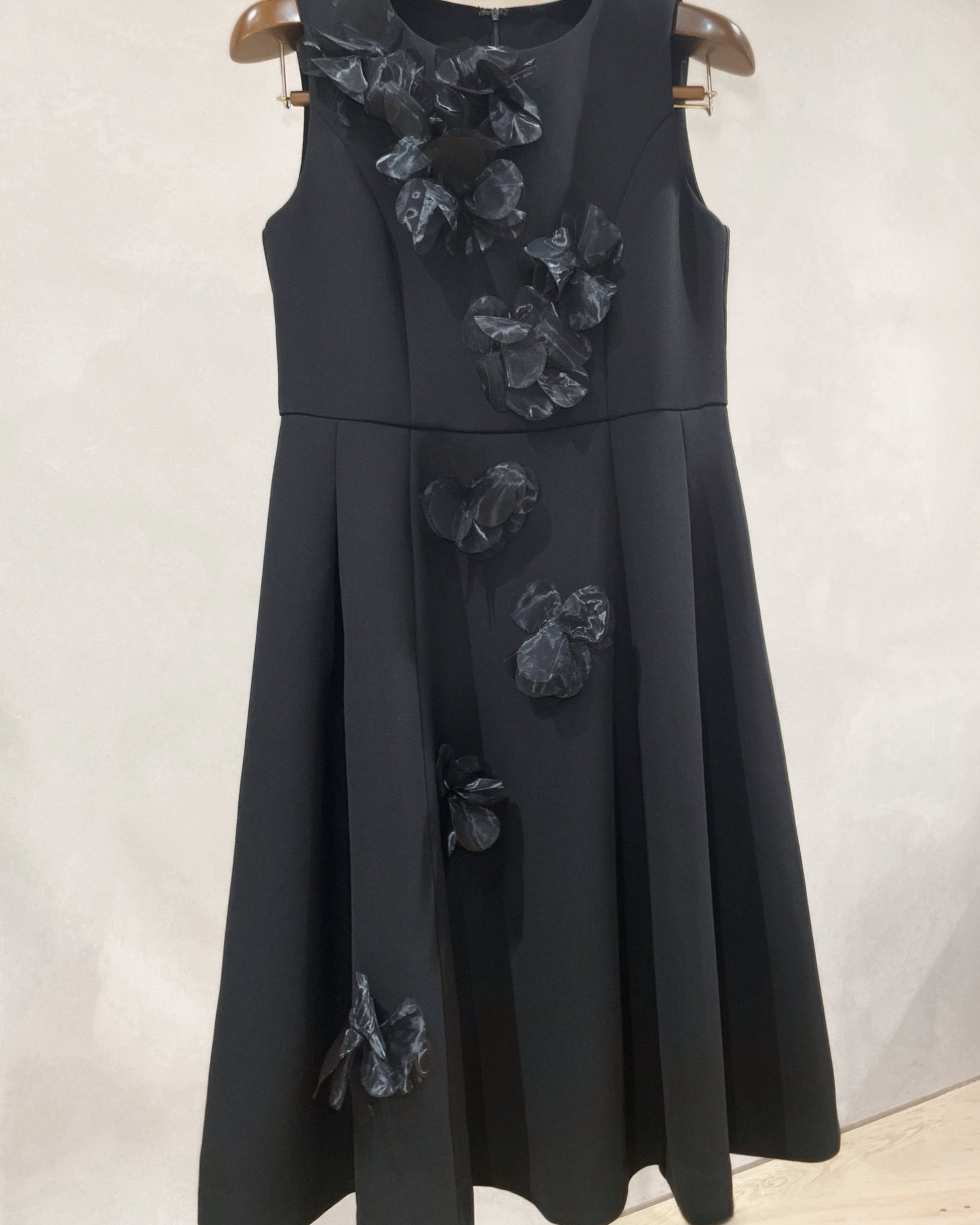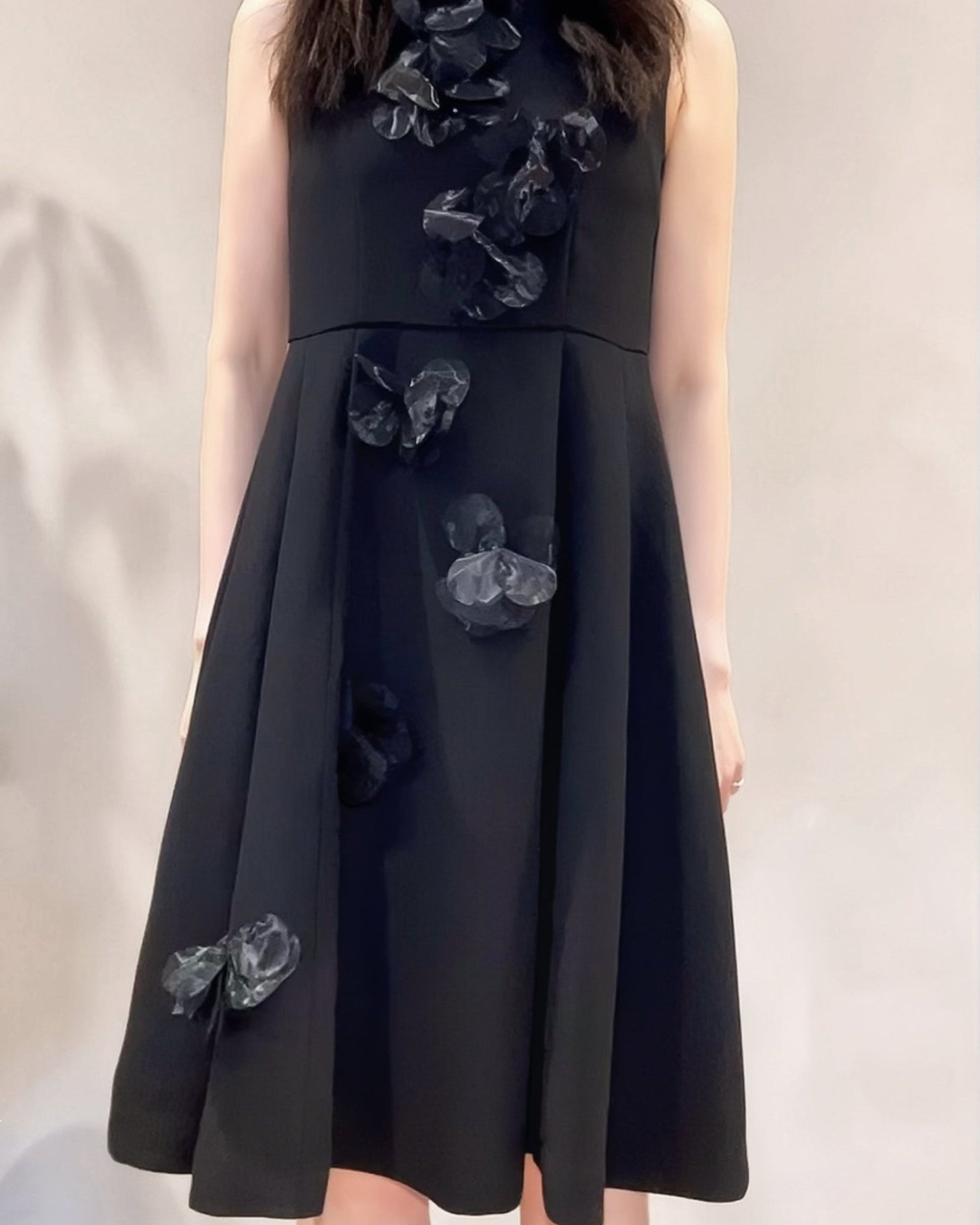 立体的なフラワーデザインが目を引く、華やかさと上品さを兼ね備えたワンピース。