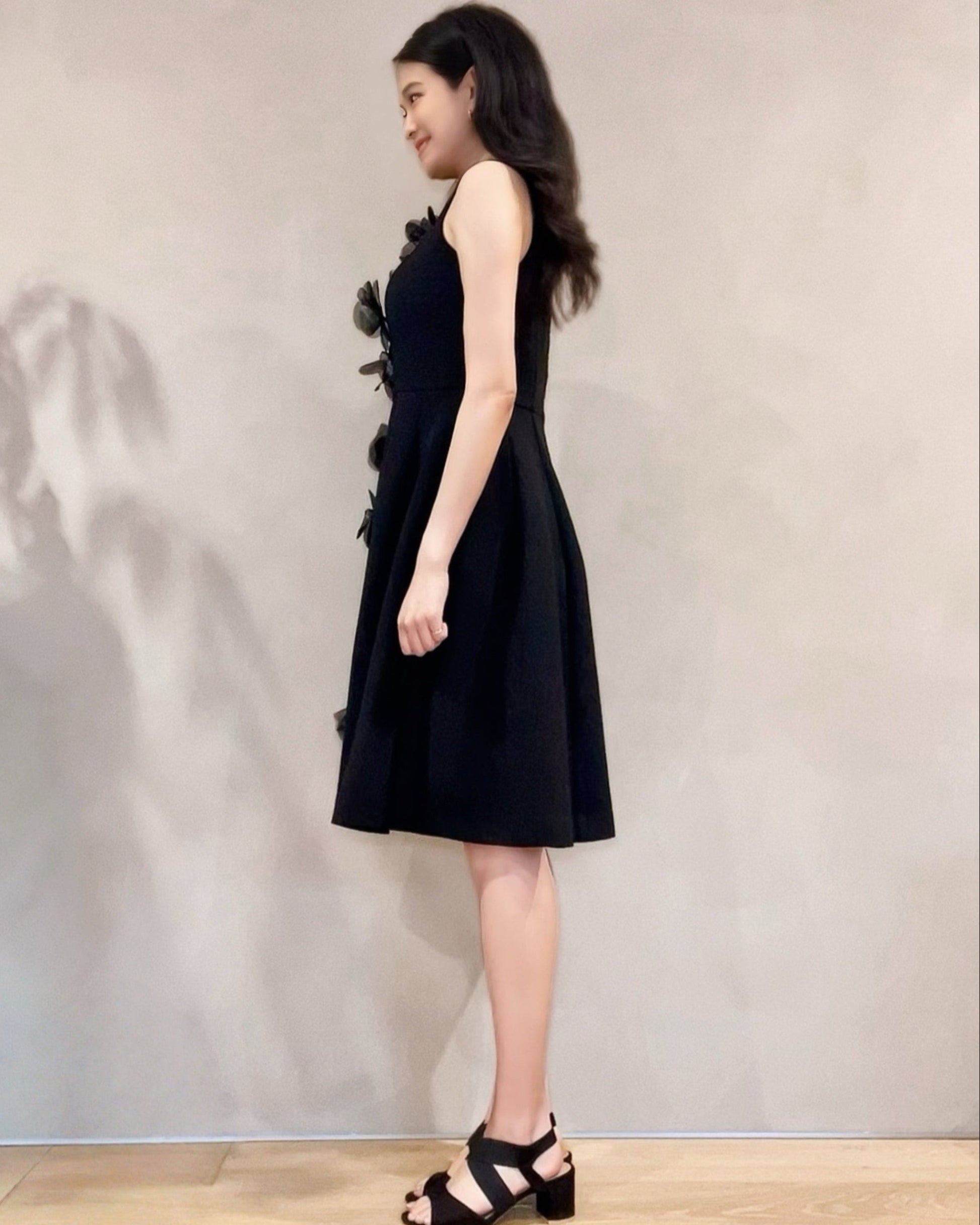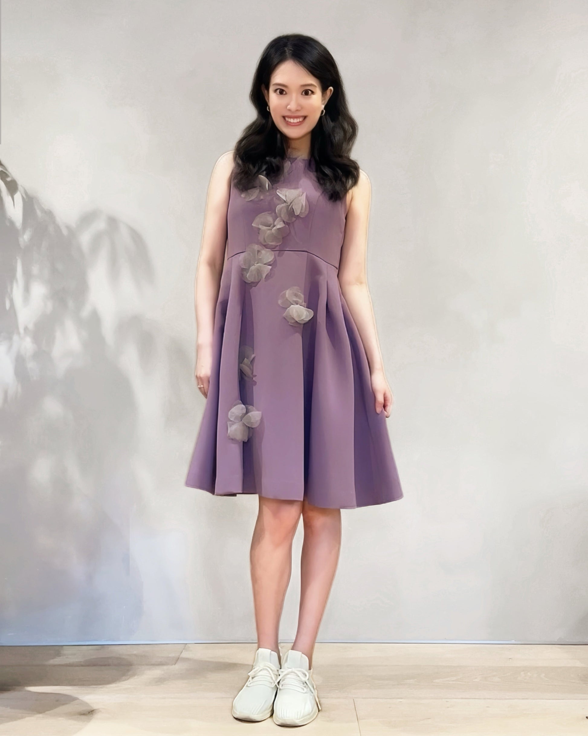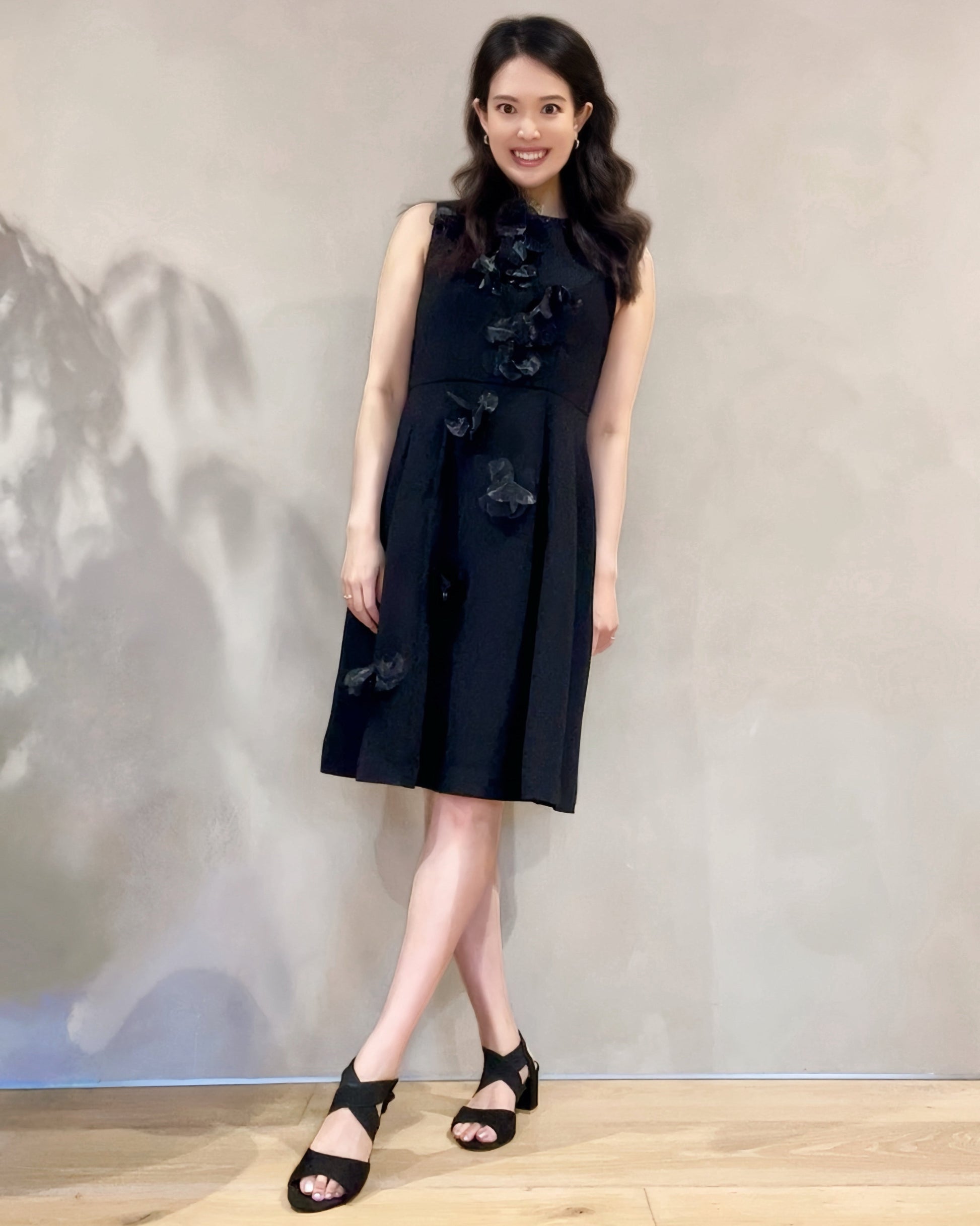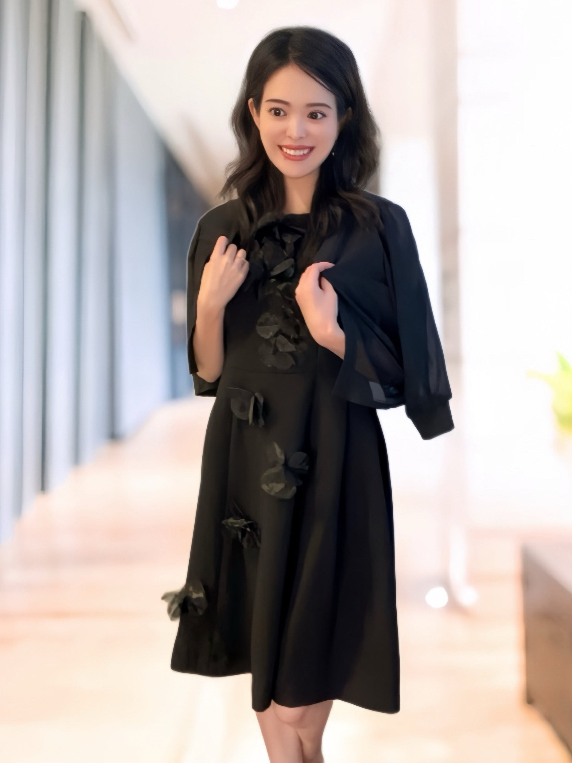 立体的なフラワーデザインが目を引く、華やかさと上品さを兼ね備えたワンピース。