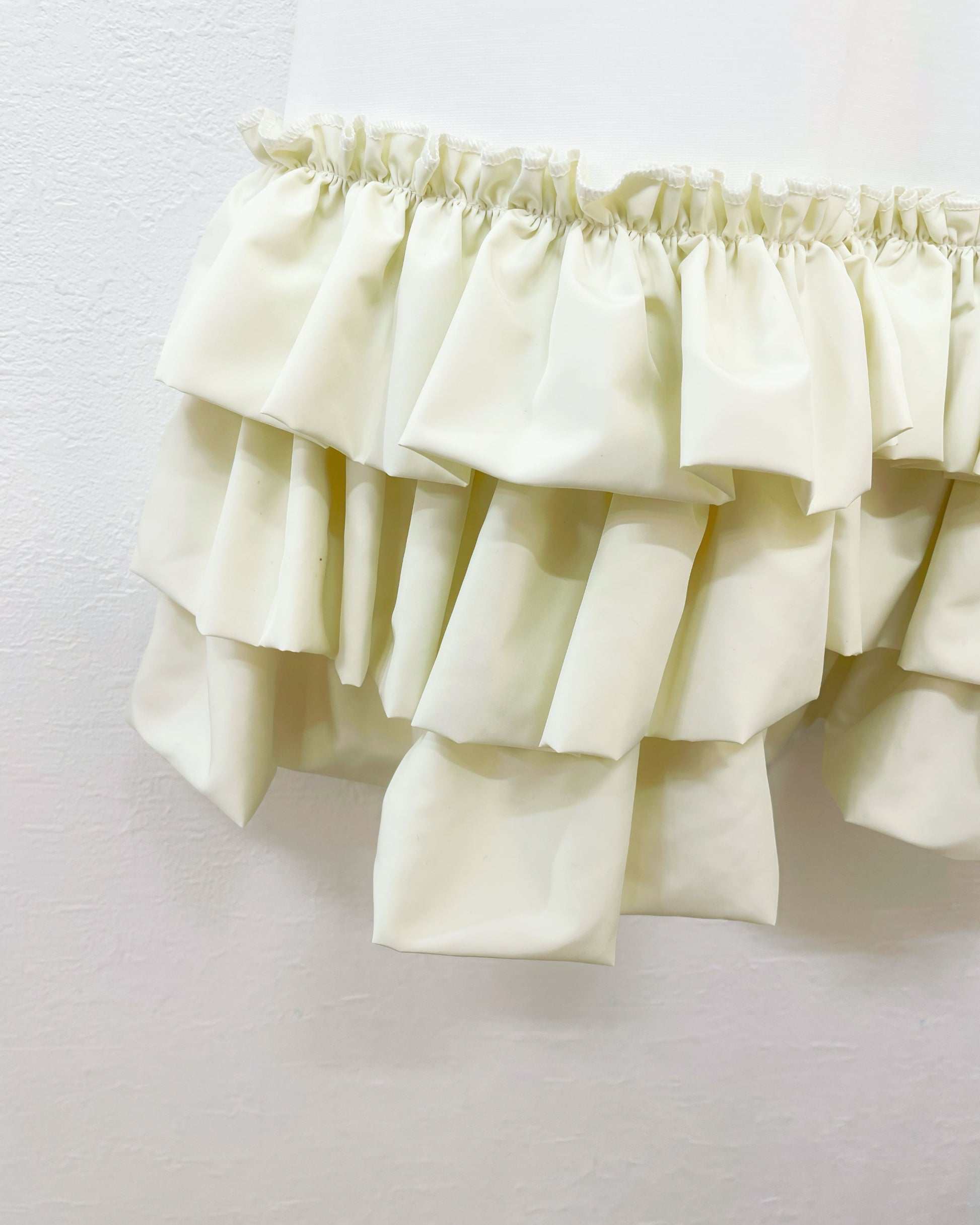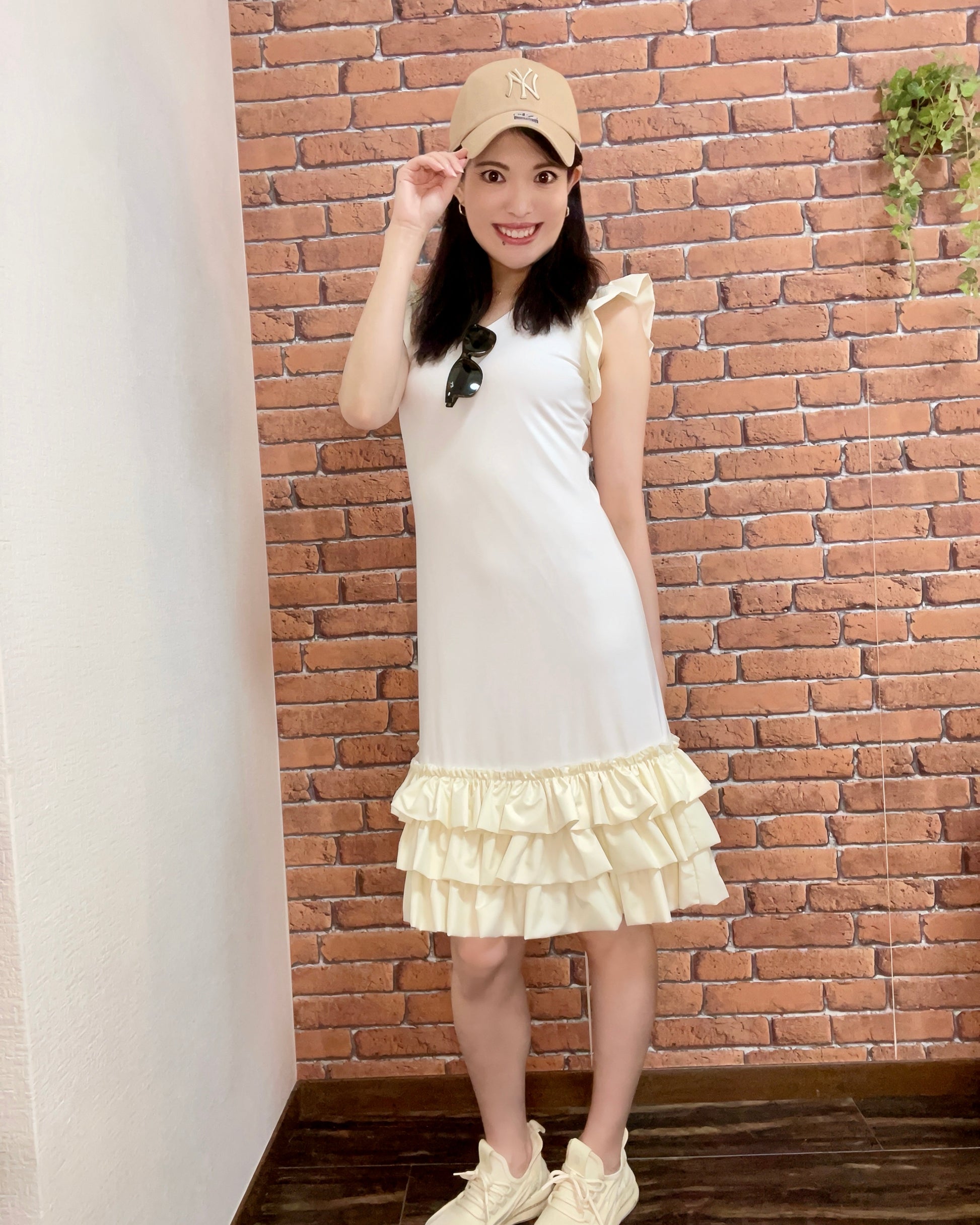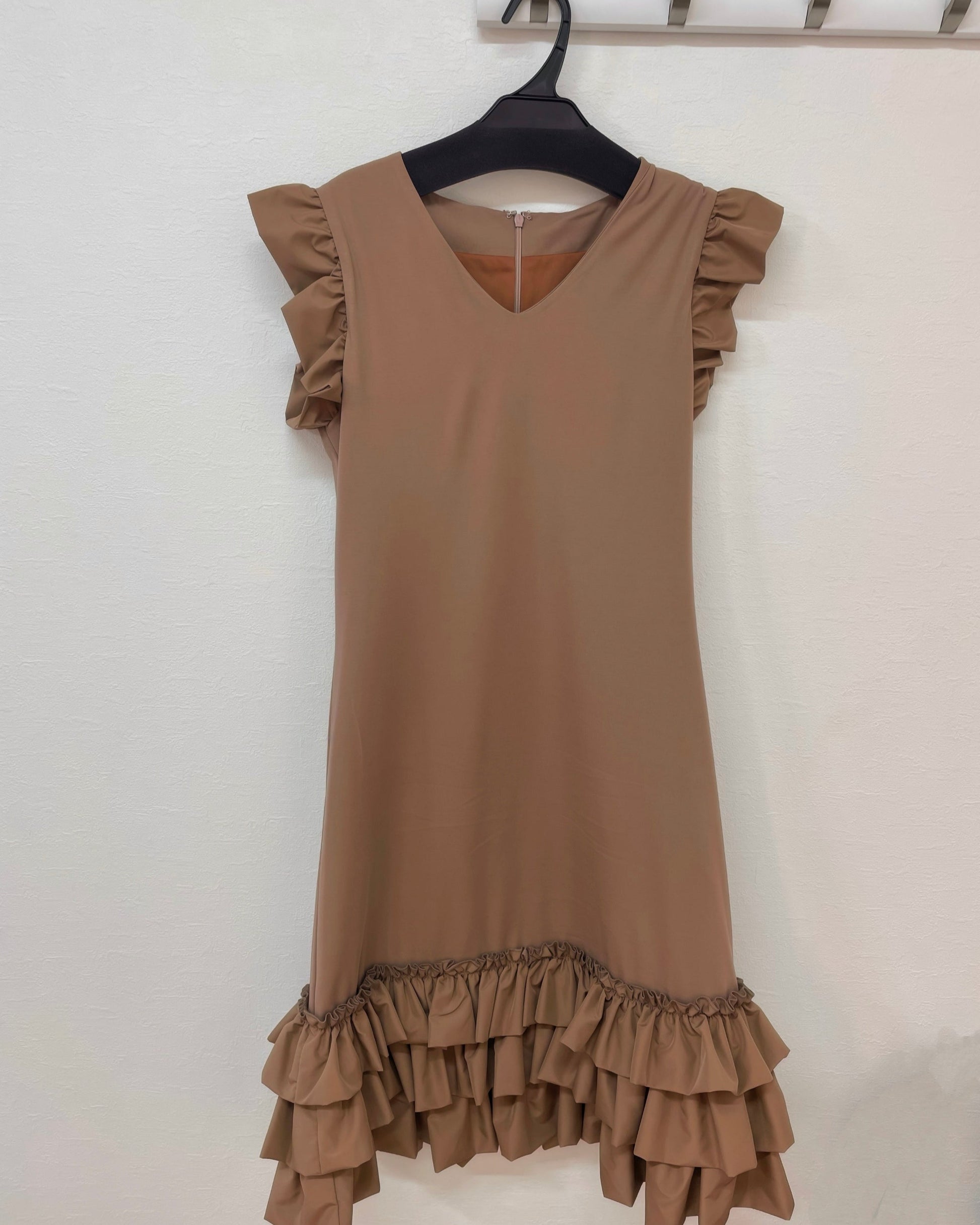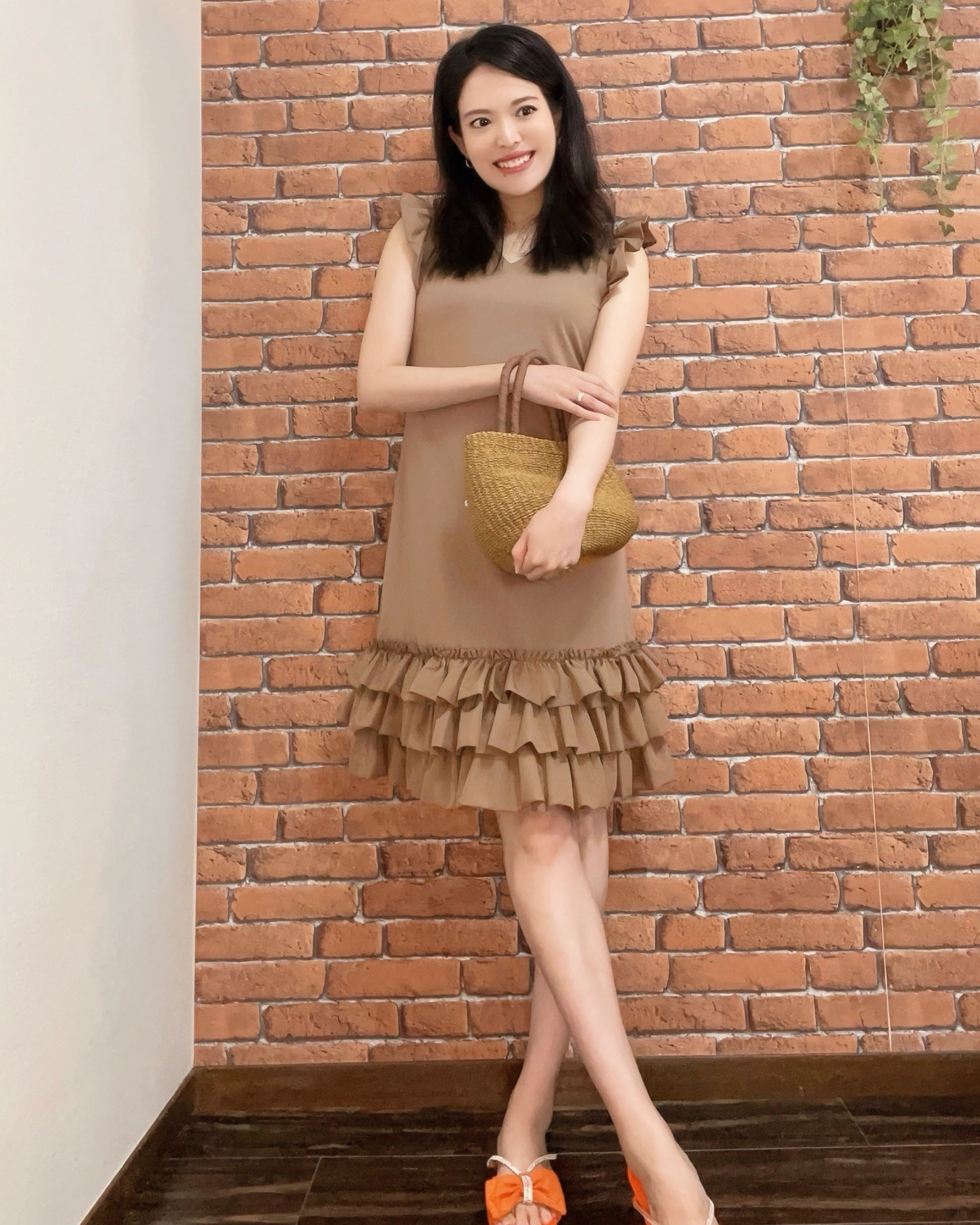 袖口と裾にあしらったフリルが、フェミニンで可愛らしい雰囲気を演出します。